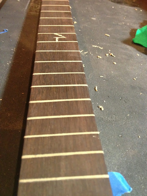 So with the neck all sanded I went ahead and cut the neck slots. Cutting through rosewood can be tricky and scary. Its such a beautiful wood its a terrible feeling when you mess it up. A few of my fret cuts were a little crooked and the arrow inlay was a little iffy (remind me to never use the ballpoint dremel bit again)